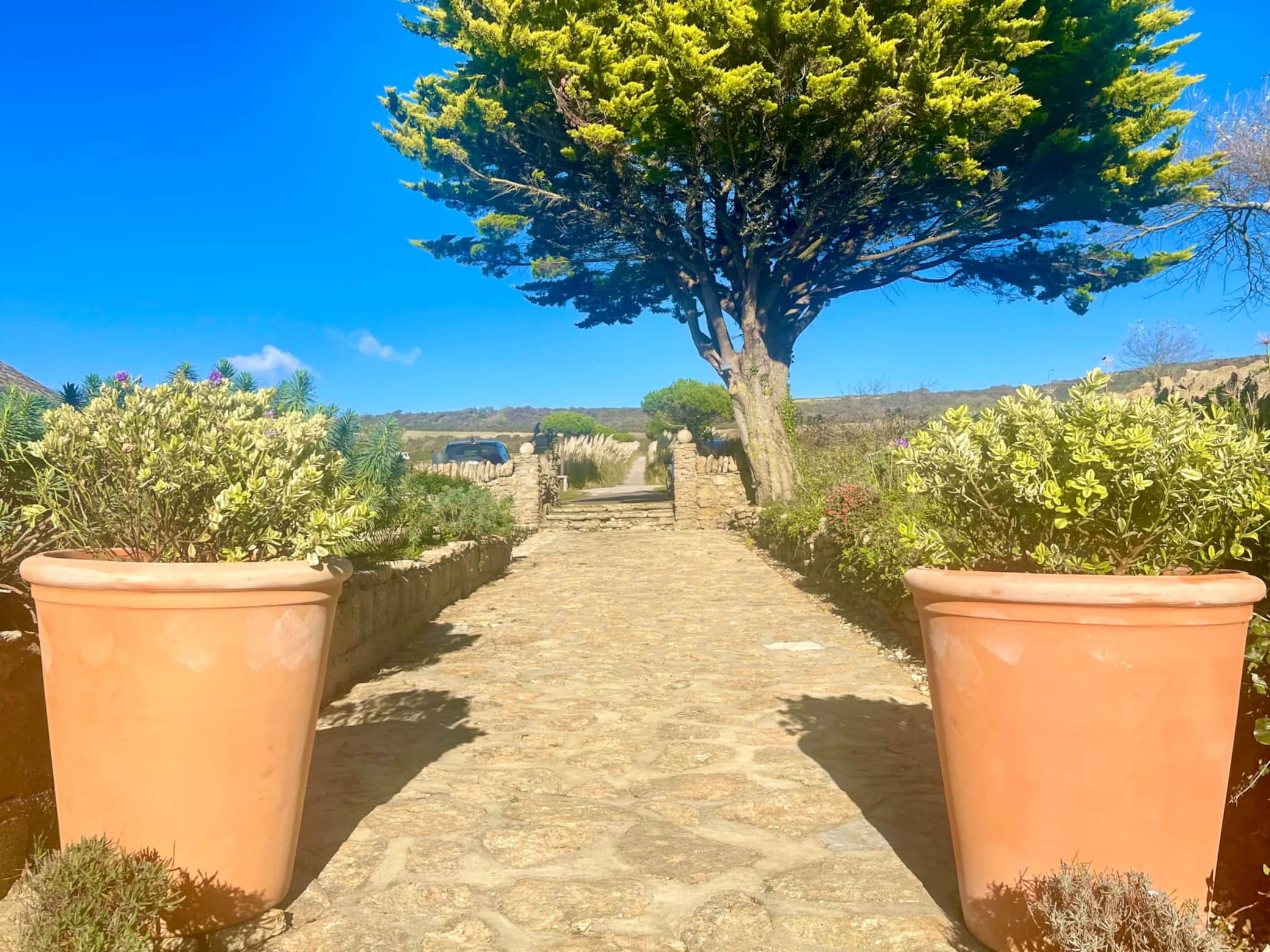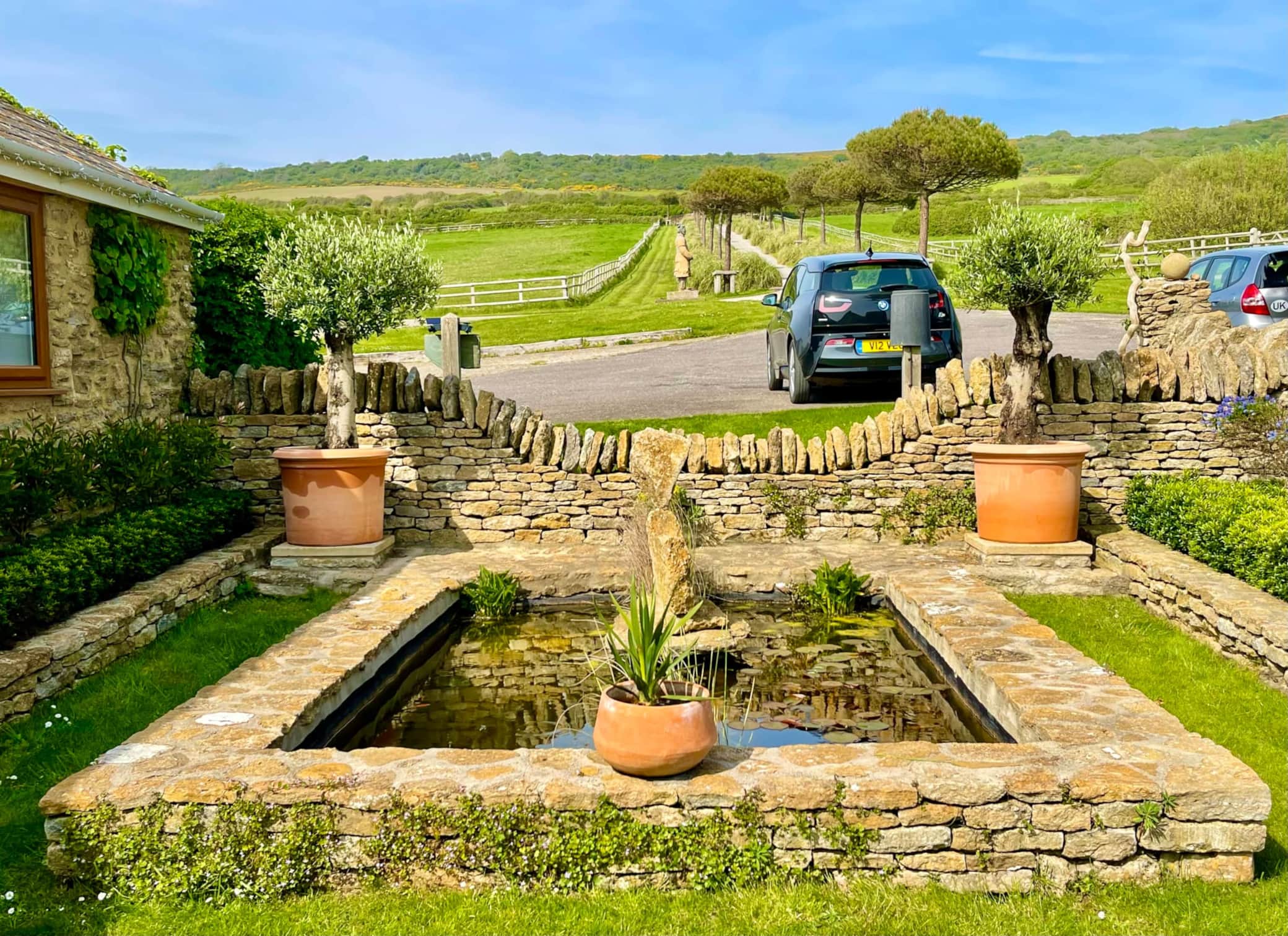 Drive through a tunnel of swaying pampas grass and umbrella pines to this recently restored Purbeck stone converted barn. The sea shimmers behind the house and a solemn terracotta warrior stands guard.